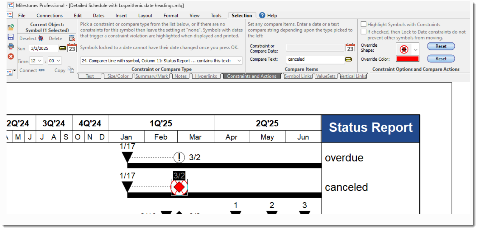 This feature makes it easier to modify specific symbols on your schedule, whether you’re shifting task dates (using the Dates Tab) or overriding symbol colors (via Selection Tab > Size/Color Sub-tab).