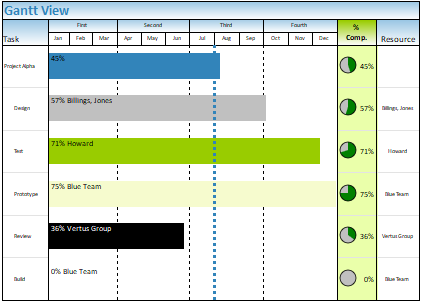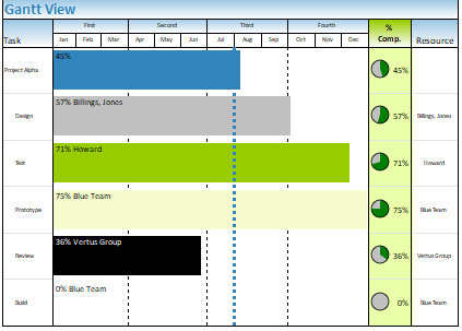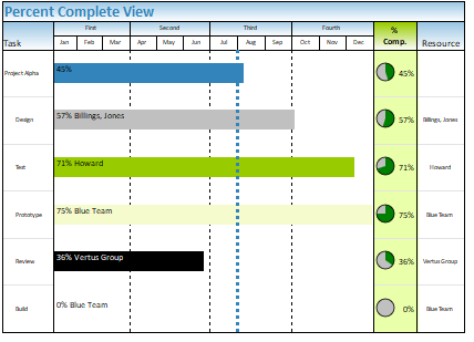 The Percent Complete view mode replaces the Gantt bars and milestones with bar graphs indicating each task's percent complete. Each task displays a red bar (default setting) indicating its percent complete. A bar's length corresponds to a task's percent complete value in relation to the date heading length. That is, a task which is 50% complete will display a red bar which traverses half of the date heading's length. The percent complete bars do not represent start and stop dates. To display the Percent Complete view, choose View | Viewing Options | Chart Type: Gantt-Percent Complete. Example: This schedule represents a typical Gantt view.