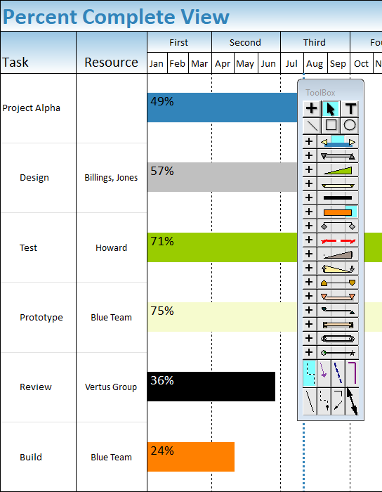 Cycle through toolbox bar colors:This option produces a more colorful percent complete view, using the colors from the schedule's toolbox. To adjust the colors, just adjust the colors of the bars in the toolbox.