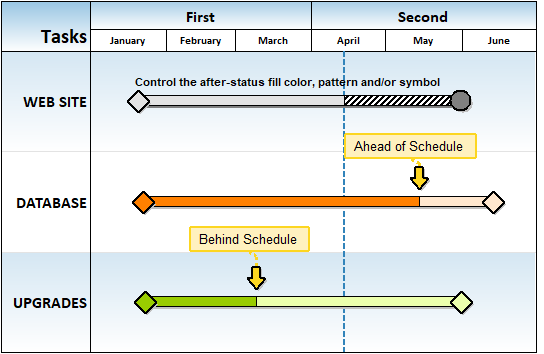 The Symbols - Fill to Status Date and Bars - Fill to Status Date feature causes symbols and bars to be filled up to the status date. After the status date, the symbols and bars will show the after status color. Symbols will show the after status (incomplete) shape if specified in the toolbox. Turn fill to status dates on: