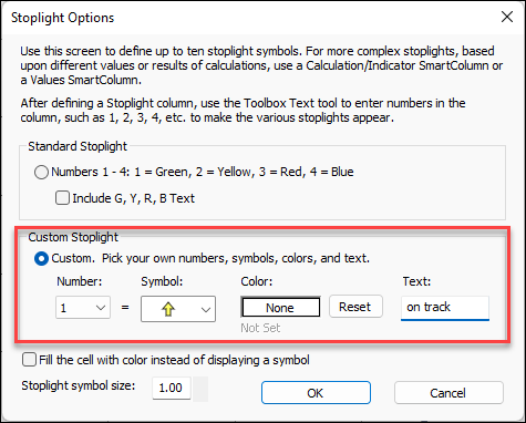 Custom Stoplights: Assign numbers 1 through 10 to any symbol, color and optional text. Optionally, display color-fills instead of the stoplights.