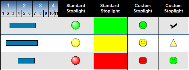 The stoplight SmartColumn offers two basic methods for displaying stoplight symbols, text and colors based on user-entered numbers 1 to 4, or 1 to 10.