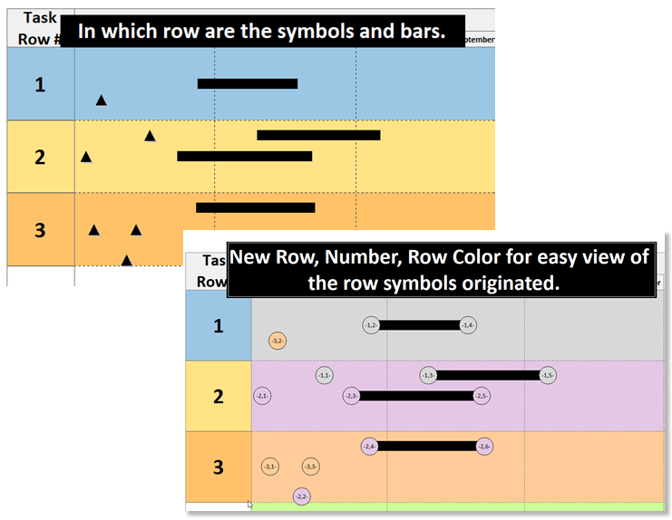 Have a very dense schedule with symbols on many levels of each task row? Now it's easy to visually tell which actual row your symbols are on.