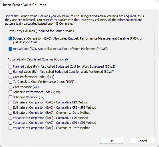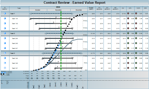 Cost Variance (CV) - CV = Earned Value - Actual Cost. Calculates the dollar value of what was accomplished to date against what has actually been spent.