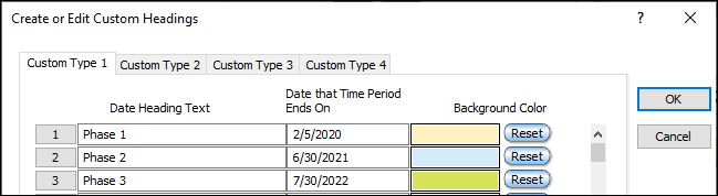 In the first cell under Date Heading Text, enter the first heading text (e.g. "Phase 1").