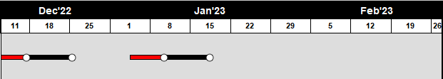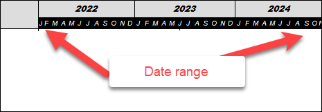 Refer to the project's starting date to determine the beginning date for the first entry's time span. That is, if the project start date is 1/1/2021 and the first date entry is 2/28/2021, then the first custom heading will span from 1/1 to 2/28.