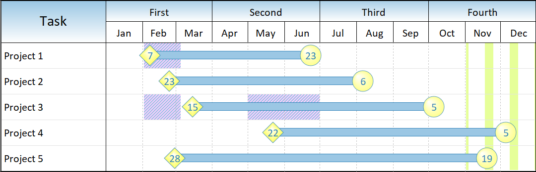 Curtains offer a way to shade any date range on a schedule. Curtains might be used to shade a critical project time span, a holiday season, every other month, or any other time period.