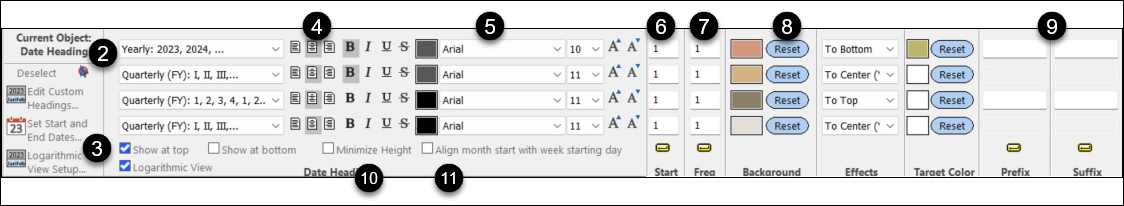 In the Frequency section, enter a value to display the Heading Type at intervals. For example, a yearly heading level with a frequency of 5 means every 5 years, a monthly heading level with a frequency of 4 means every 4 months.