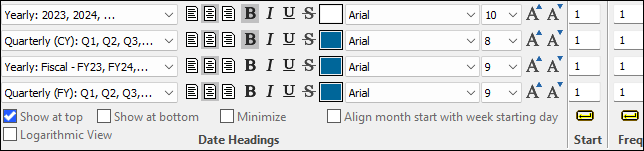 The date heading type Quarters aligns itself with fiscal years (i.e. Q1 aligns with the beginning of the fiscal year). With the start number feature, quarters can be offset to align with the calendar year. For example, if Q2 happens to align with the beginning of the calendar year, then an offset number of -1 can be entered to force Q1 to align with the beginning of the calendar year. Thus, it's possible to have "calendar year quarters" and "fiscal year quarters" in the same date heading. As shown below, quarters are aligned with the calendar years in the top two date heading rows, and aligned with the fiscal years in the bottom two rows.