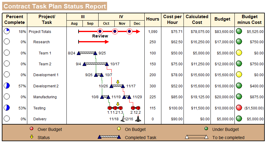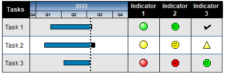 Does a project activity cost more than was planned? In a project schedule with hundreds of activities, it's helpful to display status "indicators" to show at-a-glance which activities are under/on/over budget, of long/medium/short duration, complete/started/not started, and more. Milestones displays these status "indicators" in specialized SmartColumns based upon user-defined or predefined conditions. Not only can any toolbox symbol be displayed in these SmartColumns, the "indicator" displayed can also be text, a number, color, percent pie or combinations of these items. Indicators can appear in these SmartColumns:Example of columns with indicator symbols:In the example below, the Percent Complete column displays percent complete pies, and the Budget minus Cost column displays calculated values and stoplight "indicators" based on those values.