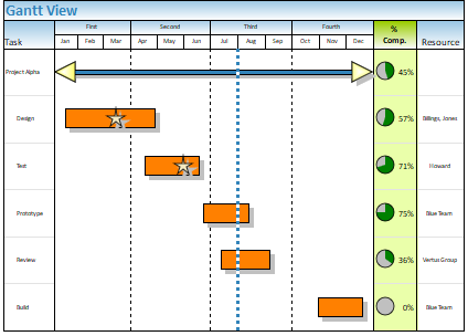 The Percent Complete view mode replaces the Gantt bars and milestones with bar graphs indicating each task's percent complete. Each task displays a red bar (default setting) indicating its percent complete. A bar's length corresponds to a task's percent complete value in relation to the date heading length. That is, a task which is 50% complete will display a red bar which traverses half of the date heading's length. The percent complete bars do not represent start and stop dates. To display the Percent Complete view, choose View | Viewing Options | Chart Type: Gantt-Percent Complete. Example: This schedule represents a typical Gantt view.