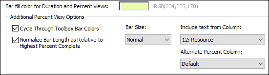 Include text from column:To display text on the percent complete bar, just pick a schedule column. Alternate percent column:By default, the task's percent complete column is used. An alternate Values column can be selected.