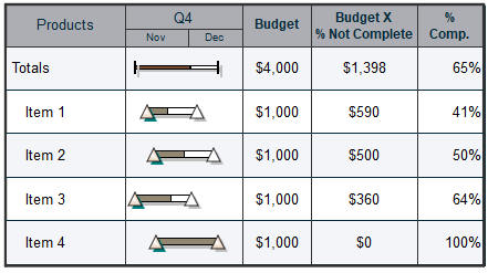 This schedule has one Values SmartColumn -- "Budget" -- and one Calculation/Indicator SmartColumn -- "Budget X % NOT Complete." The values in the "Budget" column are multiplied by the percent not complete values for each task. A Percent Complete SmartColumn is not required for this calculation.