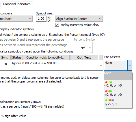 Several Predefined stoplight indicators settings are available when creating indicators for SmartColumns. When chosen, the indicators in the drop-down Pick Indicator Symbology menu will automatically switch to the predefined selections. Create Indicators using Predefined Indicator settings: