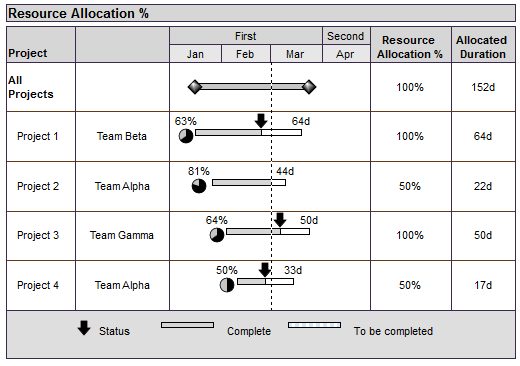 Resource Allocation Percent Example:In the example,Team Alpha will be working on Project 2 50% of the time, and Project 4 50% of the time. This does not change the durations of the tasks, yet better indicates the effort needed to complete the tasks. Thus, the overall usage of this resource is 100% for this time period. The “Allocated Duration” column is a Duration SmartColumn. To show the impact of the resource allocation percent on duration choose Apply Resource Allocation Percent for each task row to resultant Duration Display.