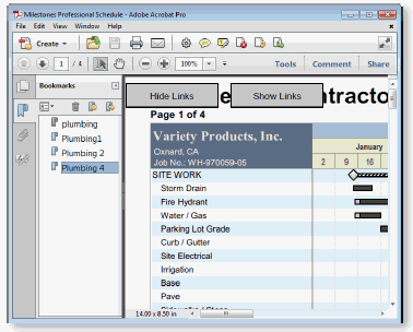 Choose File | Files and Templates: Open and Save Options | PDF to create a PDF file from the current Milestones schedule. The resulting PDF can be viewed by any PDF viewer. The PDF file automatically includes a bookmark section made up of any bookmarks in the schedule, and optional buttons for hyperlinks. Only the first hyperlink on each symbol or task row is included.