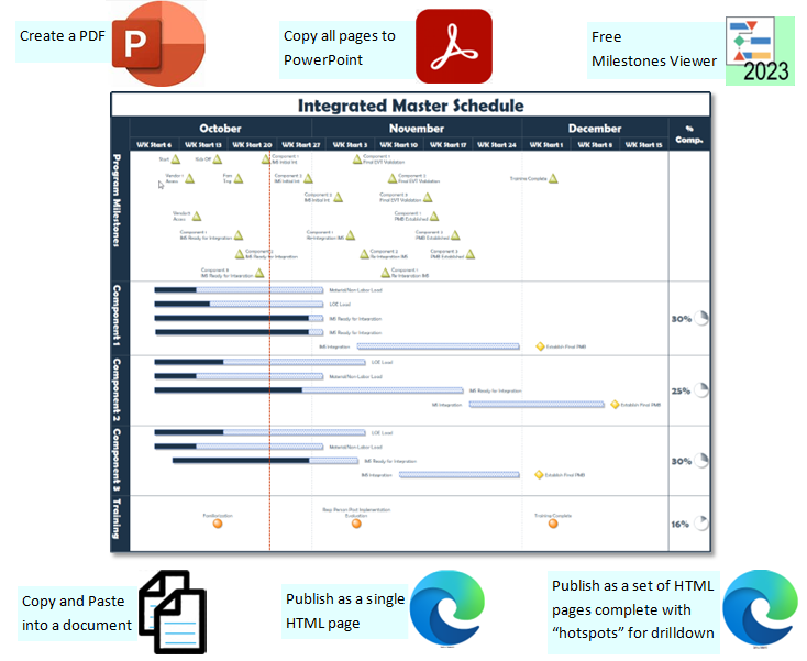 Use Milestones’ Internet Publishing Wizard to quickly and easily create schedule graphics and HTML pages-ready for your web site. And you don’t have to know a thing about HTML.