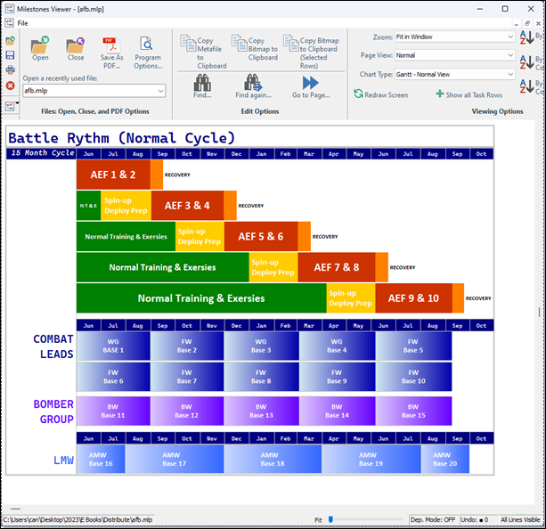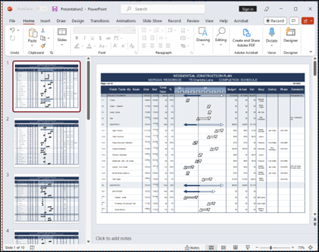 Use the Presentation view mode to present one or a series of separate Milestones schedules as a "slide show" with a full screen option and schedule manipulation controls.