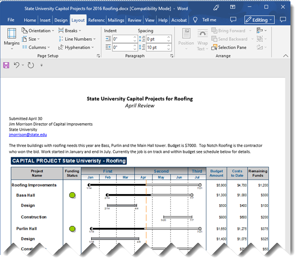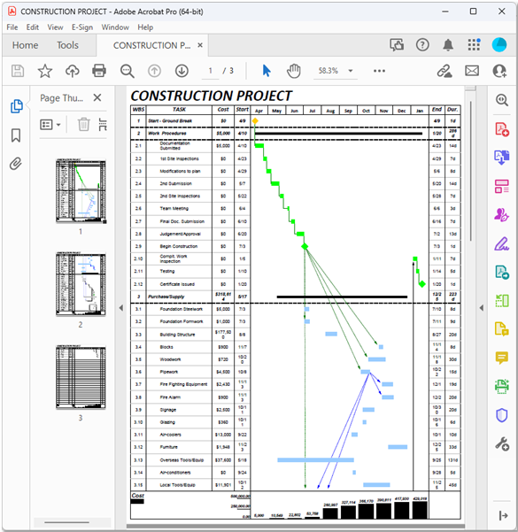 Adobe’s PDF has become a universal document exchange format. Within Milestones Professional, it’s easy to create a PDF. Just select File | Save as PDF and enter a file name. If the schedule has bookmarks, the PDF file will include a bookmark section and optional buttons for hyperlinks.