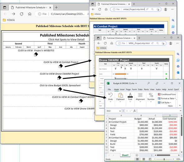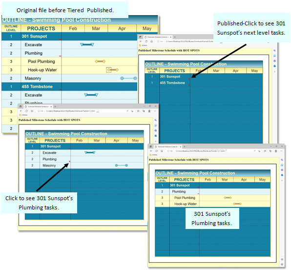 Does your schedule have links to other schedules? If so, hyperlinks will be converted into web page hotspots with drilldown capabilities. Just publish the top-level schedule as HTML and all linked schedules become linked HTML pages as well. If your schedule has symbols with hyperlinks to web pages or other documents, hotspots will be created for these as well.
