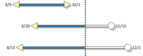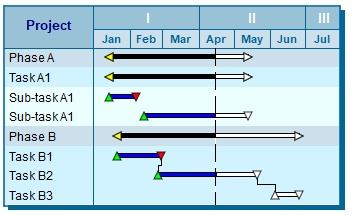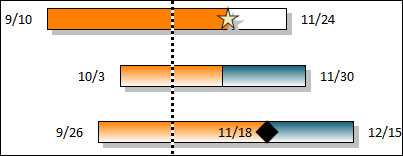 The Symbols - Fill to Status Date and Bars - Fill to Status Date feature causes symbols and bars to be filled up to the status date. After the status date, the symbols and bars will show the after status color. Symbols will show the after status (incomplete) shape if specified in the toolbox. Turn fill to status dates on: