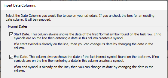 The Start Date SmartColumn will display the task's earliest date while the End Date SmartColumn displays the task's latest date. Most of the time, users click and drag to add start and end date symbols to each task row. In this case the Start Date and End Date SmartColumns are filled in automatically. It's also possible to enter dates directly into the Start Date and End Date SmartColumn cells. In this case the symbols and task bars are added to the task row automatically. When the start or end date is changed in the SmartColumn, the corresponding symbol on that task row will move to the new date. Add a Start Date or End Date SmartColumn: