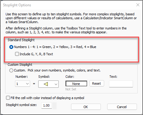 The list of available symbols for stoplights is generated from the symbols in the toolbox. Therefore, it's necessary to change the available symbols in the toolbox to change the list of available symbols for stoplights. For displaying indicator symbols or text based on other column's values or text, ranges of numbers, and calculation results, use Calculation/Indicator SmartColumns, Values SmartColumns and ValueSet SmartColumns. To go beyond these easy to use standard Stoplight columns, try setting up an Values column with indicators.