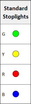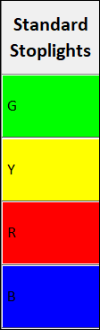 Include G, Y, R, B Text to display these letters with their appropriate stoplights or color-fills. G appears with green; Y appears with yellow; R appears with red; B appears with blue.