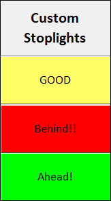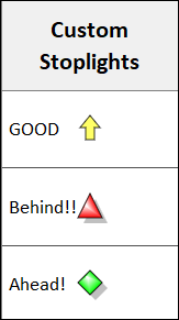Custom Stoplights: Assign numbers 1 through 10 to any symbol, color and optional text. Optionally, display color-fills instead of the stoplights.