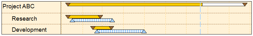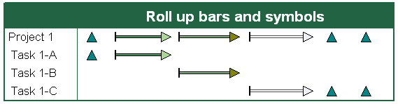 Roll-up of lower level symbols and barsNormally, summary bars display a time span reflecting the first start date and the last end date of the underlying project steps. It's possible to cause all of the lower level symbols and bars to be displayed on the summary bar.