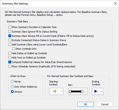 About moving symbols on summary barsSymbols on summary rows move automatically when symbols on lower level task rows move. They are drawn automatically based on the dates in the lower level tasks. Therefore, they cannot be selected or moved independently. Summary row settings can be changed in Layout | Other | Summary Bar Settings. The above is true if When to Draw is on