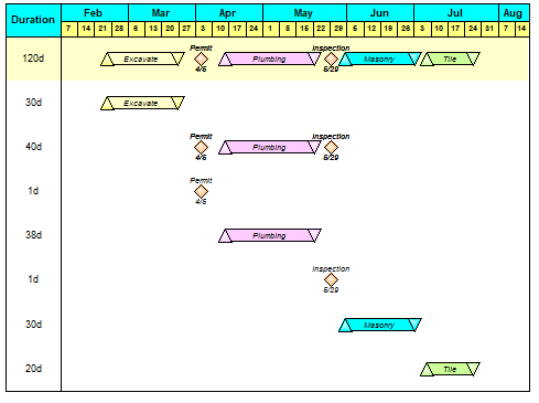 Summary bars can be displayed on an outlined schedule. These special task rows display summary information for task rows that are of a lower level. In the example below the summary bars are displayed for each street name.