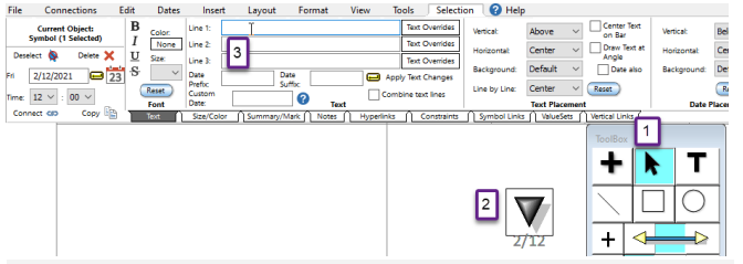 Use Toolbox and individual symbol date/text settings to revert to toolbox date and text settings and override settings for symbol on the schedule.