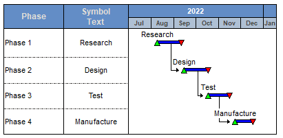 In this example, the symbol text of the first symbol in every task row is automatically displayed in the "Phase Name" column, which is a Symbol Text SmartColumn.