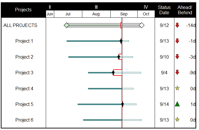 Example: Time Ahead/Behind SmartColumnThe example below shows some tasks ahead of schedule (positive value), some on schedule (zero value) and some behind schedule (negative value). Indicator symbols appear based on the column values.